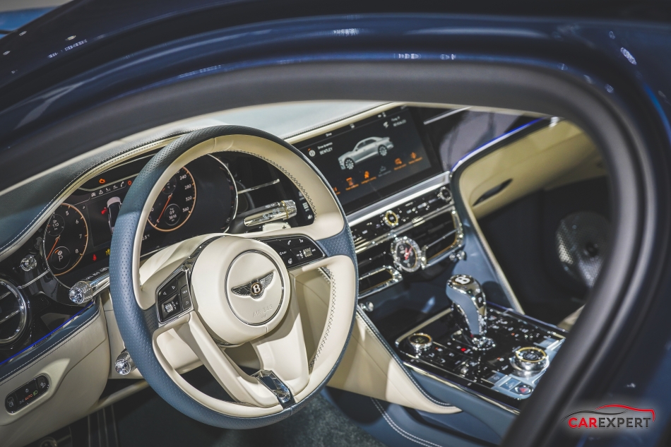 內裝方面,Flying Spur 佈局也與 Continental GT 相近、由中控台延伸至車門兩側的鍍鉻飾條為主線,象徵 Bentley 廠徽中的翅膀環繞座艙,12.3 吋數位儀表板與中控台三片式翻轉介面也如出一徹,後座也配有能操控遮陽簾、後排座椅按摩功能、空調以及前段所述車頭廠徽功能的可分離 10.2 吋觸控裝置;在奢華方面,若選配米勒套件即可享有源於 Bentley EXP 10 Speed 6 概念車的雙菱形絎縫座椅,以外縫線、內刺繡來造就華麗的座椅/內飾花紋,同時還有鑽石滾花飾面點綴。