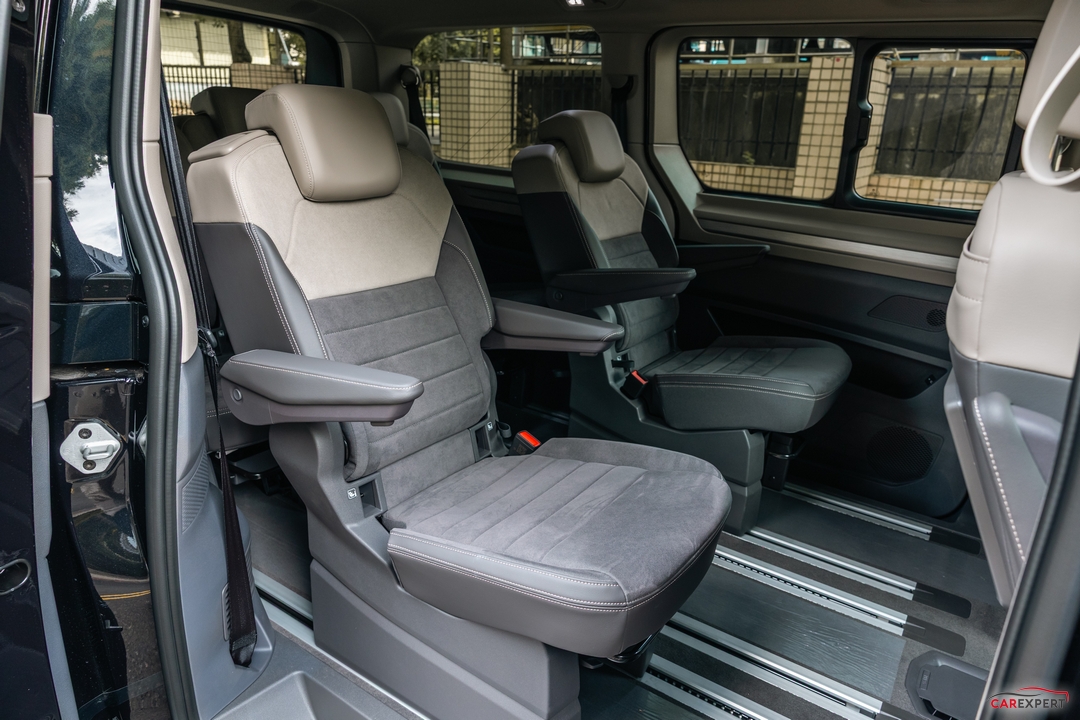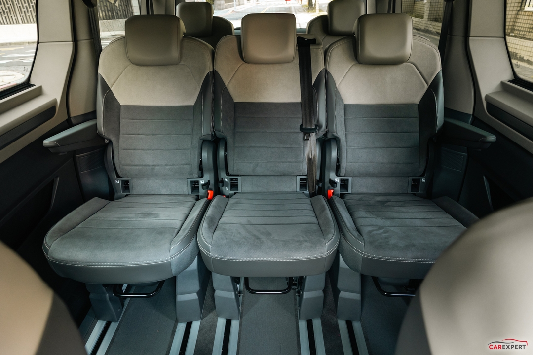 本車雖是七人座,但可以是「2-2-3」也可以「2-3-2」,關鍵就在二、三排座椅張張都能獨立滑移和拆卸,這也造就了當2–2-3時,第二排就是兩張獨立Captain Seat,把第三排中央椅滑到前面補位,第二排就成長條椅,若把椅背打平就是會議桌,此外有一二排椅背都有折疊餐桌,兩側上方也有空調出風口、電動滑門都沒少,加上空間方正,全車七座都能坐得很舒服!行李裝載上,既有空間就很夠用,當需要大容量行李空間時,可藉折疊或拆卸第三排座,來滿足裝載需求。